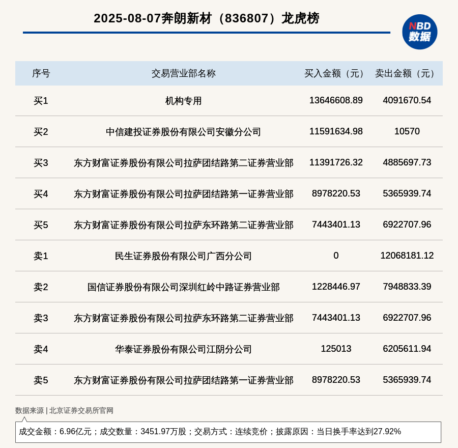 每經(jīng)訊,2025年8月7日,北交所上市公司奔朗新材(836807,收盤價:21.2元)登上龍虎榜,交易方式是連續(xù)競價,披露原因是當(dāng)日換手率達(dá)到27.92%,成交數(shù)量3451.97萬股,成交金額6.96億元。買一席位為機(jī)構(gòu)專用,買入1364.66萬元;賣一席位為民生證券股份有限公司廣西分公司,賣出1206.82萬元。