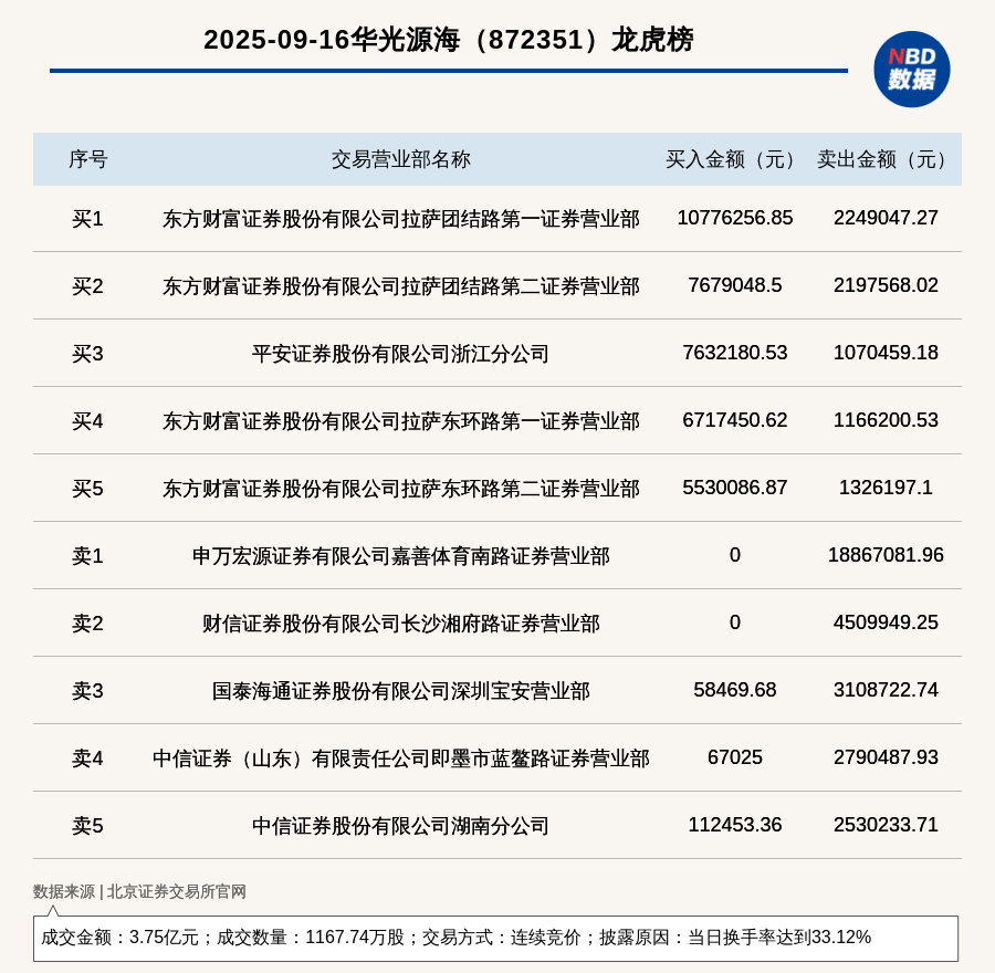每經(jīng)訊,2025年9月16日,北交所上市公司華光源海(872351,收盤價:32.8元)登上龍虎榜,交易方式是連續(xù)競價,披露原因是當(dāng)日換手率達(dá)到33.12%,成交數(shù)量1167.74萬股,成交金額3.75億元。買一席位為東方財富證券股份有限公司拉薩團(tuán)結(jié)路第一證券營業(yè)部,買入1077.63萬元;賣一席位為申萬宏源證券有限公司嘉善體育南路證券營業(yè)部,賣出1886.71萬元。