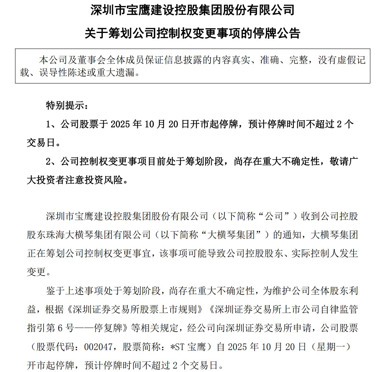 根據(jù)*ST寶鷹10月20日發(fā)布的《關(guān)于籌劃公司控制權(quán)變更事項的停牌公告》,公司于當日收到控股股東大橫琴集團的通知,后者正在籌劃涉及公司的控制權(quán)變更事宜。公告明確指出,該事項可能導致公司控股股東、實際控制人發(fā)生變更。