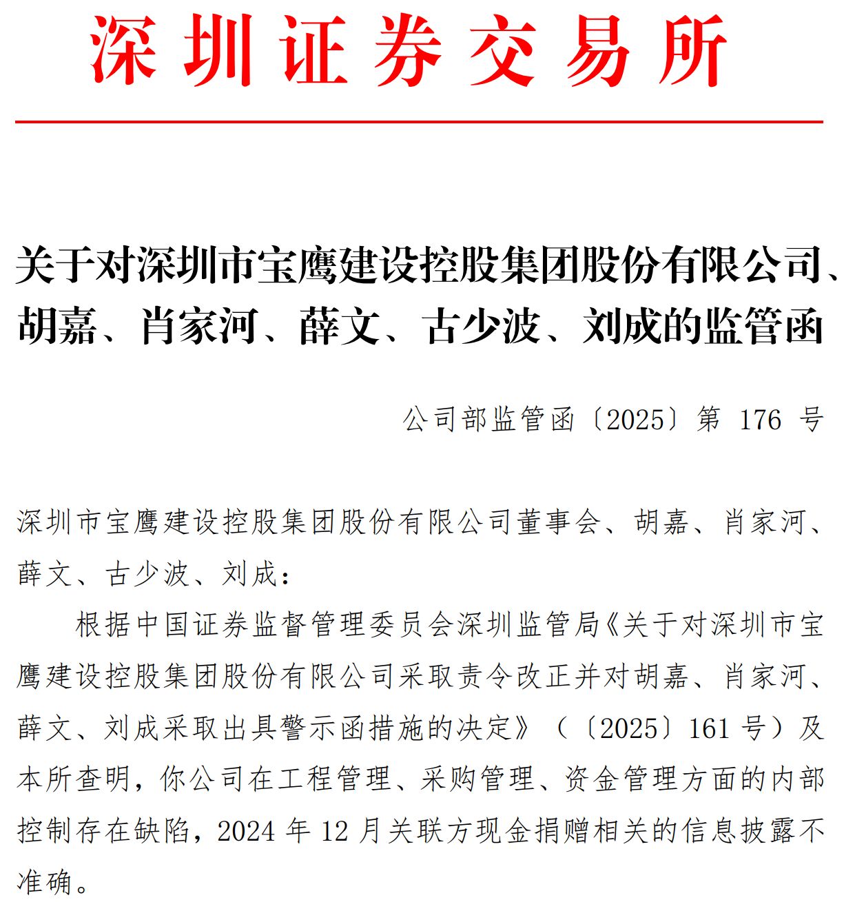 就在停牌公告發(fā)布前兩日,*ST寶鷹及相關(guān)責任人剛剛收到深圳證監(jiān)局的行政監(jiān)管措施決定書。深圳證監(jiān)局指出,*ST寶鷹在工程管理、采購管理、資金管理方面的內(nèi)部控制存在缺陷,且2024年12月關(guān)聯(lián)方現(xiàn)金捐贈相關(guān)的信息披露不準確。