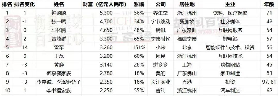 榜單顯示,農(nóng)夫山泉鐘睒睒、字節(jié)跳動張一鳴、騰訊馬化騰位居榜單前三位。翰森的鐘慧娟以1410億元取代娃哈哈的宗馥莉(875億元)成為中國女首富。