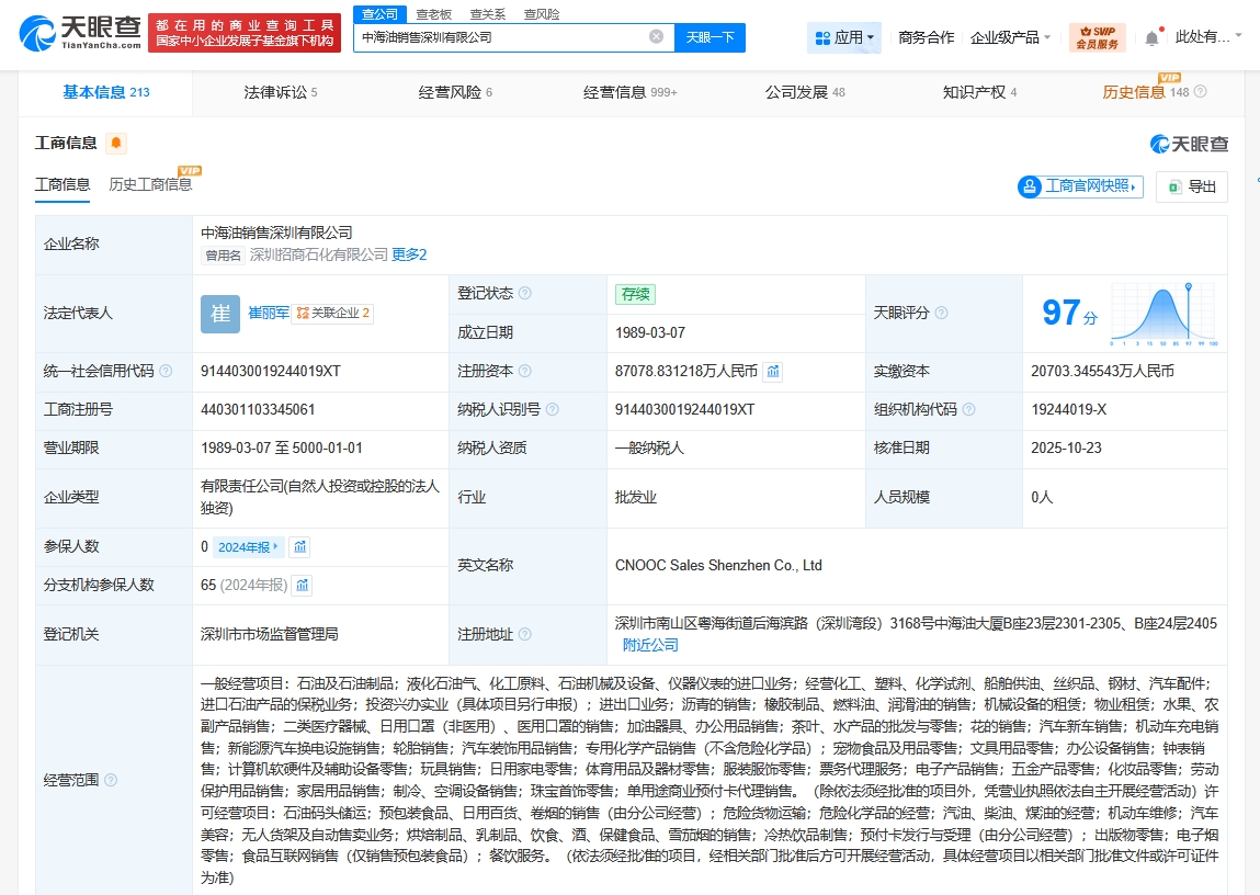 每經(jīng)AI快訊,天眼查App顯示,近日,中海油銷售深圳有限公司發(fā)生工商變更,注冊(cè)資本由約2.1億元人民幣增至約8.7億元人民幣,增幅約321%,同時(shí),部分主要人員也發(fā)生變更。該公司成立于1989年3月,法定代表人為崔麗軍,經(jīng)營(yíng)范圍含石油及石油制品,液化石油氣、化工原料、石油機(jī)械及設(shè)備、儀器儀表的進(jìn)口業(yè)務(wù),經(jīng)營(yíng)化工、塑料、化學(xué)試劑、船舶供油、絲織品、鋼材、汽車配件等,由中海油廣東銷售有限公司全資持股。